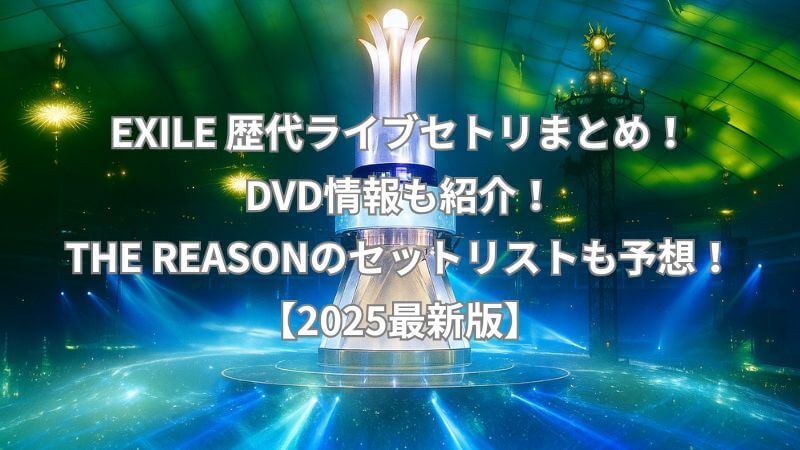 EXILE EXILE 歴代ライブセトリまとめ!DVD情報も紹介!THE REASONのセットリストも予想!【2025最新版】 EXILEの歴代ライブツアーセトリをファン目線のコメント付きで紹介!2007年「EVOLUTION」から最新ツアー「What Is EXILE」までの軌跡をまとめました。また、THE REASONのセトリ予想も! 2025.10.11 EXILE